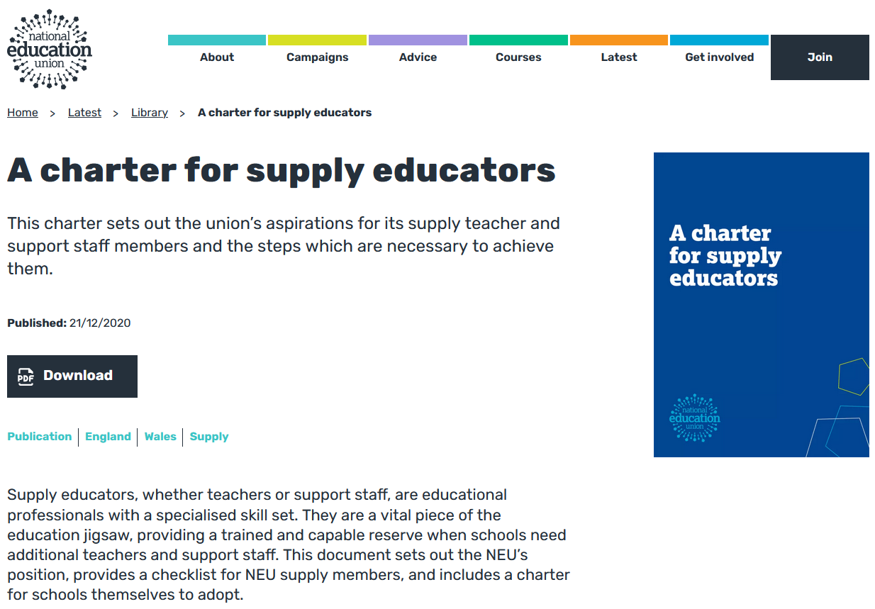 This charter will be e-mailed to NUT school representatives, urging them to hold a meeting of members to highlight the shabby treatment of supply teachers by agencies in terms of inadequate pay and lack of opportunity to make pension contributions, and then, with members’ support, seek to persuade their head teacher to adopt the principles of the Charter. The Charter has already been highlighted in the winter 2013 issue of Headway and will also be e-mailed to supply teacher members.